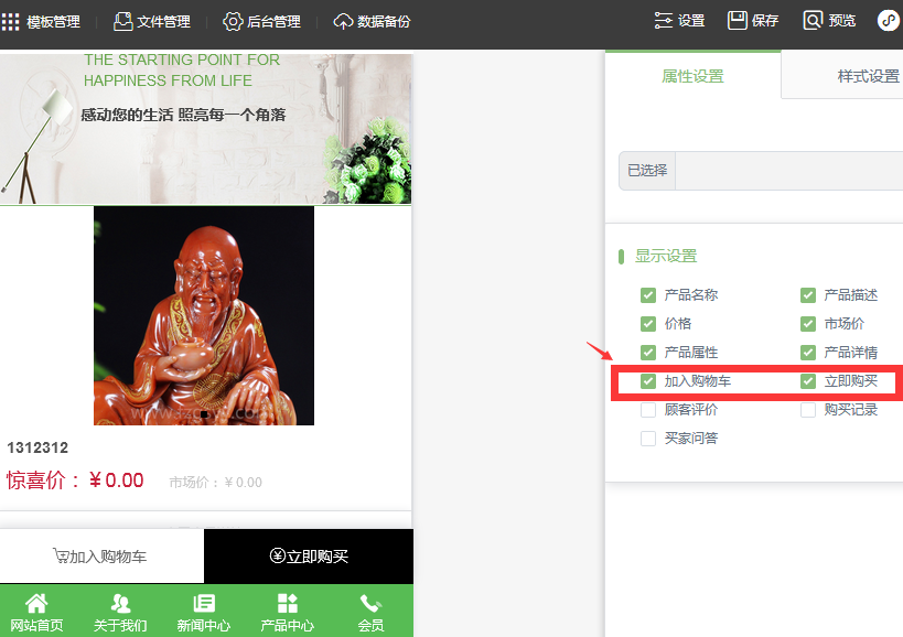 2、在前台编辑页面 产品详情页 -》属性设置中勾选 加入购物车和立即购买。保存重新下载app然后上传到小程序发布即可。